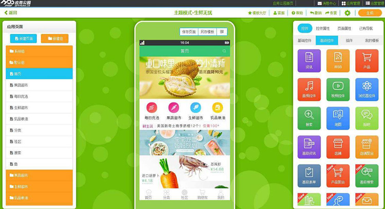 當(dāng)然,應(yīng)用公園并沒有因?yàn)椴僮麟y度降低而影響到APP本身的質(zhì)量。在平臺(tái)正式上線前期,應(yīng)用公園的技術(shù)團(tuán)隊(duì)便投入了很大精力去研發(fā)調(diào)整功能控件,目前已積累到超過一百種,涵蓋到方方面面,讓生鮮配送APP的開發(fā)非常緊跟時(shí)代需求。