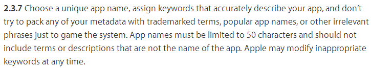 大意為:選擇一個(gè)與眾不同的名字,您的App關(guān)鍵詞要能很好的描述您的APP應(yīng)用。不要試圖堆砌品牌詞、熱門App名字,以及毫不相關(guān)的短語來挑戰(zhàn)App Store系統(tǒng)。蘋果可能會(huì)在任何時(shí)間修正不合適的關(guān)鍵詞。